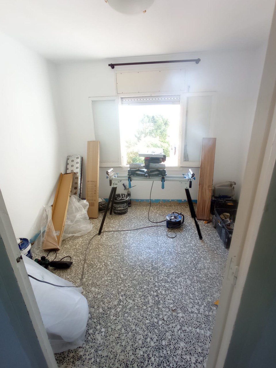 Se hizo retirada de los zócalos antiguos, rebaje de puertas y colocación de los materiales.
